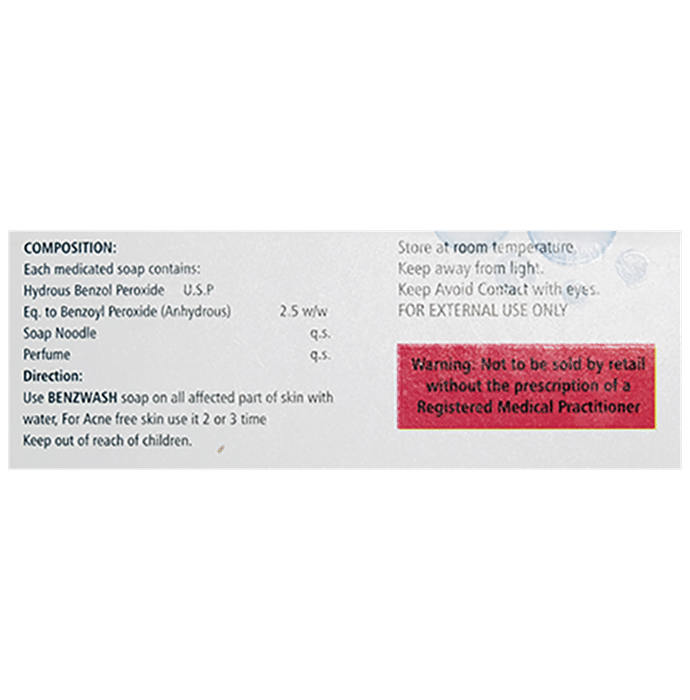 Benzwash Soap is an anti-bacterial medicine that helps treat acne. Acne appears as spots or pimples on your face chest or back. This medicine works by killing acne-causing bacteria.Benzwash Soap may be used alone or with other acne treatments. You should use it as advised by your doctor. Follow the instructions provided in the product leaflet to get the most out of this medicine. Wash and dry the affected area before medicine application. It is usually used once or twice a day. Do not apply it to damaged or broken skin and avoid contact with your mouth eyes and nose. It may take several weeks for your symptoms to improve keep using it as advised. Consult your doctor after a month of regular use of this medicine if your condition is not improving.Benzwash Soap has some common side effects including itching stinging peeling and redness of the skin. They are not usually serious but tell your doctor if they bother you or do not go away. You may need to apply a smaller amount or use it less often. This medicine can make you more sensitive to sunlight. While using it try to avoid exposure to too much sunlight. If this is unavoidable apply the medicine in the evening. It can also bleach hair and fabrics including clothes so be careful to avoid contact with these.It is a safe medicine but you should tell your doctor if you have other skin conditions and if you are using any other medicines especially those applied to the skin. It may not be suitable if you have very sensitive skin. Ask your doctor about using this medicine if you are pregnant or breastfeeding.