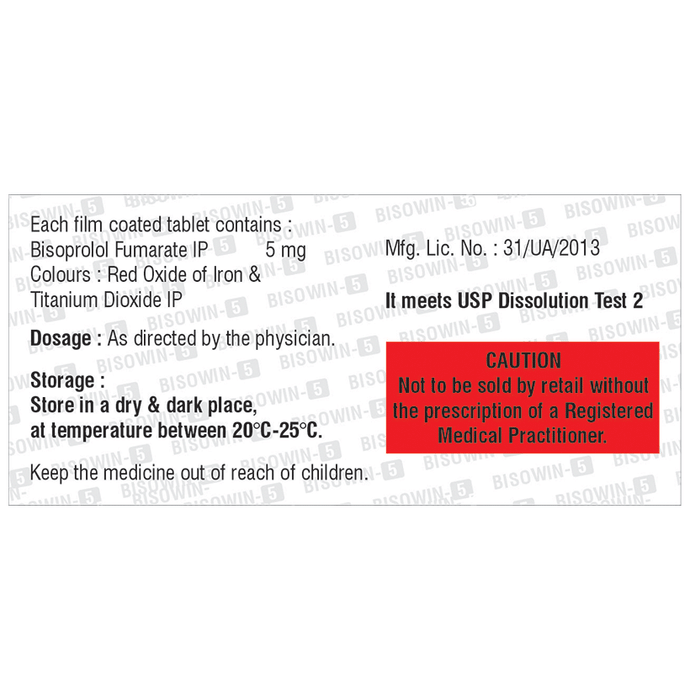 Bisowin 5 Tablet belongs to a group of medicines called beta-blockers. It is used to treat high blood pressure (hypertension) angina (heart-related chest pain) irregular heart rhythms (arrhythmia). It also helps to prevent future heart attacks.Bisowin 5 Tablet is also used to relieve the symptoms caused by an overactive thyroid gland. It may be prescribed alone or together with other medications. The dose and frequency depend on what you are taking it for and the severity of your condition. It may be taken empty stomach or with a meal but take it regularly at the same time each day to get the most benefit. It may take several weeks before you get the full benefit of this medicine and you may need to take it for the rest of your life. However it is important to continue taking it even if you feel well. Most people with high blood pressure do not feel ill and if you stop taking it your condition may worsen.The main side effects of this medicine are fatigue headache slow heart rate dizziness and nausea. These are usually mild and short-lived. It may also cause shortness of breath or low blood pressure in some people. To reduce the risk of side effects your doctor will probably start the medicine at a low dose and gradually increase it. Consult your doctor if the side effects bother you or do not go away.Before taking it let your doctor know if you have any liver problems. It may also not be suitable for people who have a slow heart rate severe circulation problems severe heart failure or low blood pressure. Pregnant or breastfeeding mothers should also consult their doctor before taking it. You should have your blood pressure checked regularly to make sure that this medicine is working properly. Avoid drinking alcohol as it may increase certain side effects.