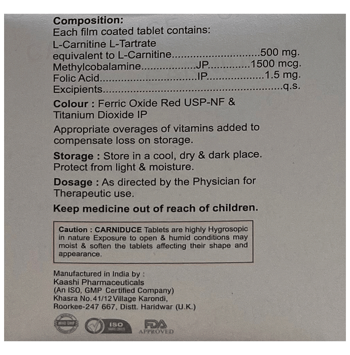 Salt Composition Levo-carnitine (500mg) + Methylcobalamin (1500mcg) + Folic Acid (1.5mg)