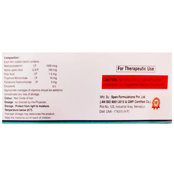 Salt Composition Methylcobalamin (1500mcg) + Alpha Lipoic Acid (100mg) + Thiamine mononitrate (10mg) + Pyridoxine Hydrochloride (3mg) + Folic Acid (1.5mg)