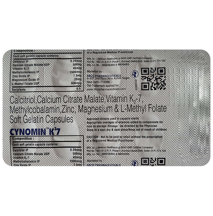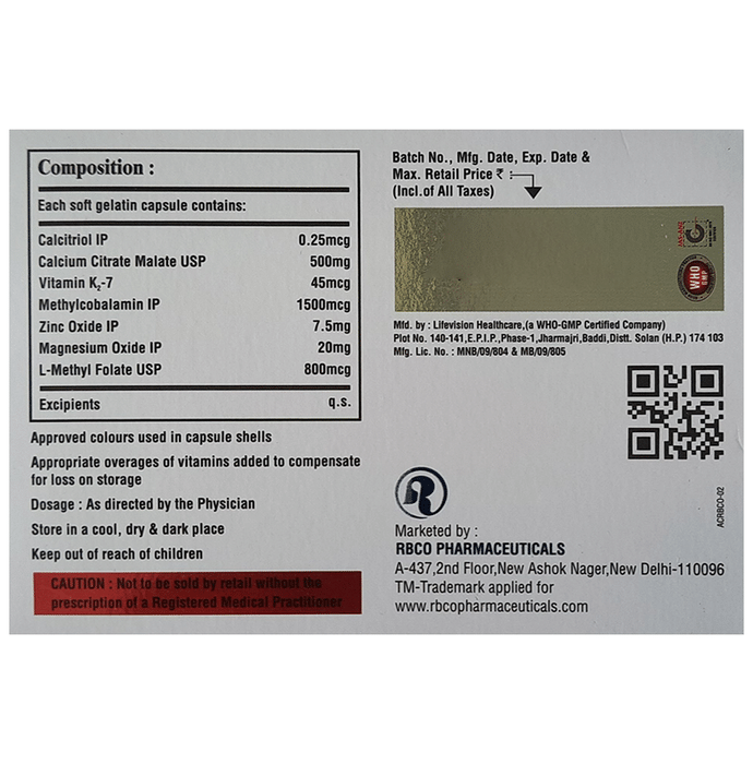 Salt Composition Calcitriol (0.25mcg) + Calcium citrate (500mg) + Vitamin K2-7 (45mcg) + Methylcobalamin (1500mcg) + Zinc Oxide (7.5mg) + Magnesium Oxide (20mg) + L-Methyl Folate (800mcg)