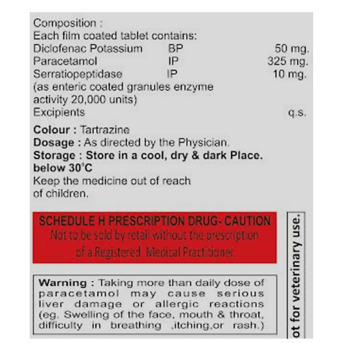 Salt Composition Diclofenac (50mg) + Paracetamol (325mg) + Serratiopeptidase (10mg)