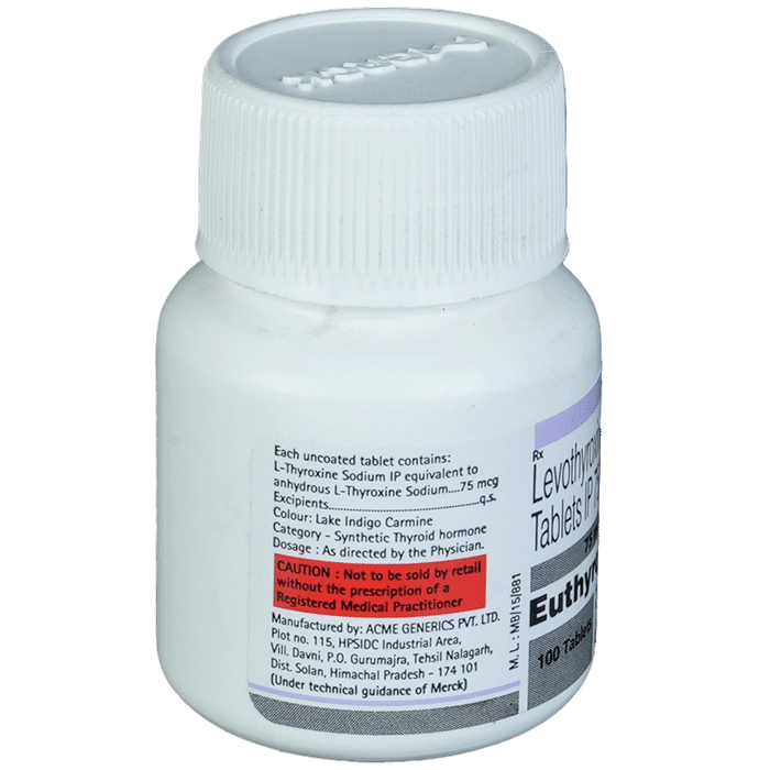 Euthyrox 75 Tablet is a medicine used to treat an underactive thyroid gland (hypothyroidism). It replaces the hormone which is not being produced by your thyroid gland in sufficient quantity and helps regulate your body’s energy and metabolism.Before you start taking Euthyrox 75 Tablet your doctor will do a blood test to see what dose you need. Once you start taking the medicine you will have regular blood tests to see how well it is working and the dose may be adjusted from time to time. It is best taken on an empty stomach before your first meal of the day. You should take this medicine regularly to get the maximum benefit. It may take several weeks before your symptoms start to improve. You may need to take it for the rest of your life. If you stop taking it your symptoms are likely to come back.The most common side effects of this medicine are caused by taking a higher dose than you need. Possible side effects include palpitations (irregular heartbeat) vomiting anxiety diarrhea weight loss tremors increased appetite and restlessness. Most side effects will disappear once you are on the right dose. Call your doctor straight away if you have a very high temperature fast or irregular heart rate low blood pressure yellowness in the eye/skin confusion or fits.Euthyrox 75 Tablet may cause weight loss but should not be prescribed or taken to treat obesity. If you become pregnant while taking this medicine inform your doctor right away as the dose may have to be increased/readjusted. Many other drugs affect the way this medicine works. Ask your doctor for advice if you are taking any other medications.