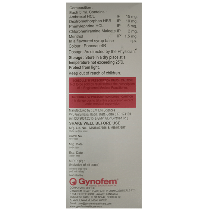 Salt Composition Ambroxol (15mg/5ml) + Dextromethorphan Hydrobromide (10mg/5ml) + Phenylephrine (5mg/5ml) + Chlorpheniramine Maleate (2mg/5ml) + Menthol (1.5mg/5ml)