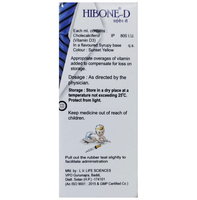 Hibone-D Oral Drops 800IU Mango Flavoured is used in the treatment of vitamin D deficiency and osteoporosis. It helps the body to absorb calcium. Calcium is essential for maintaining strong and healthy bones. it is used when your diet does not provide enough.Hibone-D Oral Drops 800IU Mango Flavoured should be taken as directed by your doctor. It is best taken with or after food as this helps your body absorb it and you should take it regularly to get the most benefit. If you are using it to treat osteoporosis you will be prescribed other medicines as well. This medicine may be only part of a complete program of treatment that also includes making changes to your diet and taking calcium and vitamin supplements. Learn about the foods you should eat to make sure you get enough calcium and vitamin D in your diet.Hibone-D Oral Drops 800IU Mango Flavoured has few side effects and none are common. If you take too much you may feel weakness muscle pain or have a metallic taste in your mouth. If experience any such side effects speak with your doctor. They may be able to help you reduce or treat the symptoms.Before taking this medicine tell your doctor if you have high levels of calcium in your blood or if you have any heart kidney or liver disease. Some other medicines can decrease the absorption of vitamin D3 so let your doctor know all other medicines you are taking to make sure you are safe. This medicine may help during pregnancy when your body needs more vitamin D but too much could harm your baby. Discuss with your doctor.