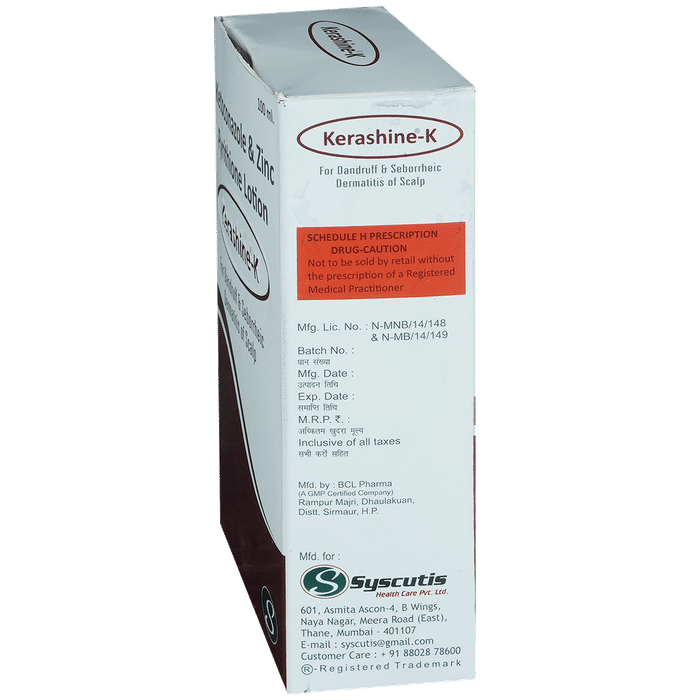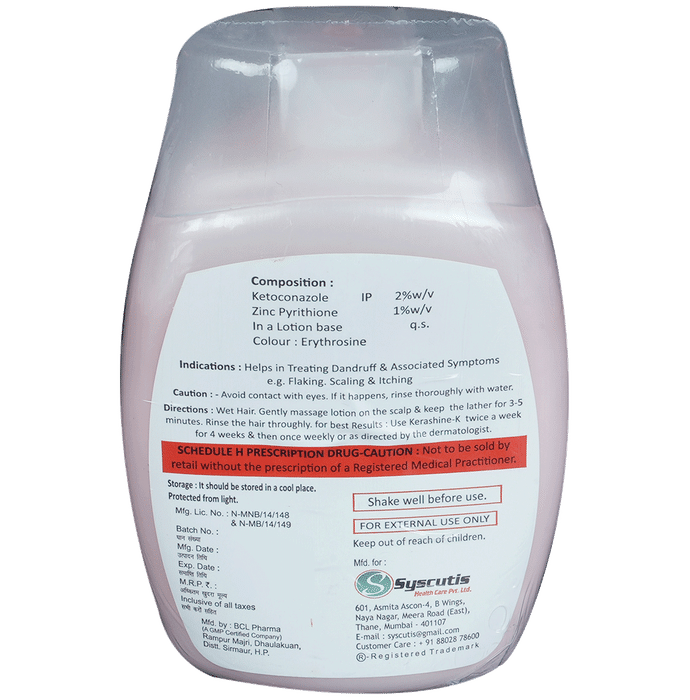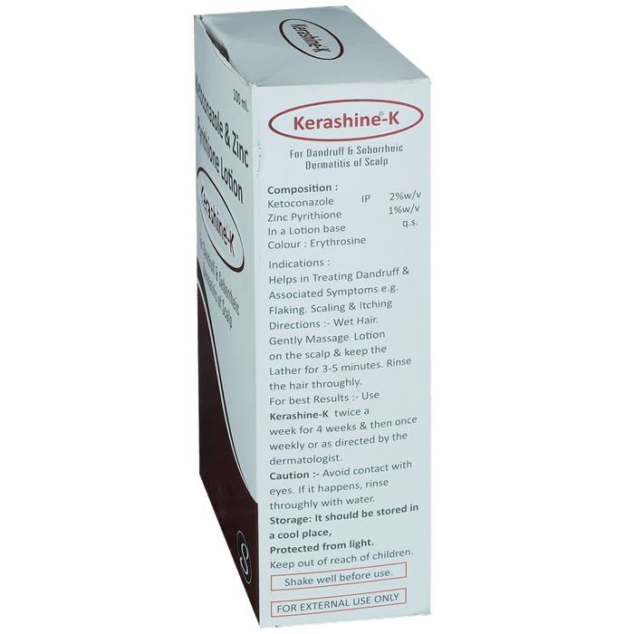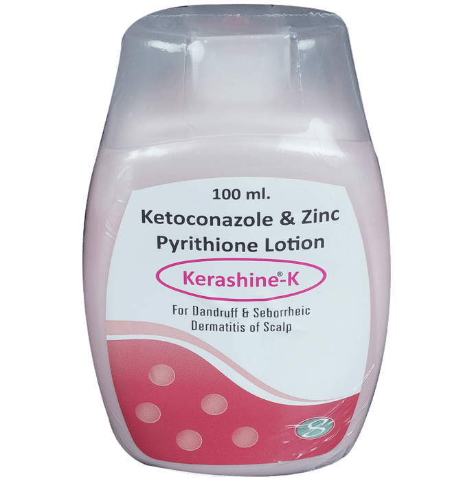 Kerashine-K Lotion is a combination of two antifungal medicines that effectively treat fungal skin infections and dandruff. It kills the fungi that cause the infection and relieves itching and irritation.Kerashine-K Lotion is only meant for external use and should be used as advised by your doctor. A thin layer of the medicine should be applied only to the affected areas of the skin with clean and dry hands. Wash your hands before and after application of the medicine. If it gets into your eyes nose or mouth rinse with water. It may take several days to weeks for your symptoms to improve but you should keep using this medicine regularly. The course of the treatment should be completed to ensure better efficacy of the medicine.This medicine is usually safe to use with no common side effects. However consult with your doctor if you experience application site reactions such as burning redness and itching of skin.It is not likely that other medicines you take by mouth or injection will affect the way this medicine works but talk to your doctor before using it if you have recently used another medicine for dandruff. The medicine is not recommended for pregnant women. Pregnant and breastfeeding mothers should consult their doctors before using this medicine.