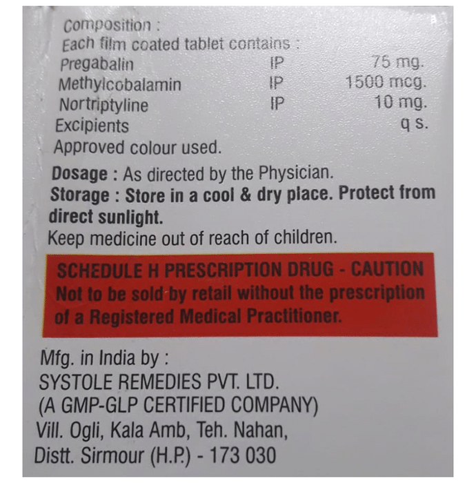 Salt Composition Pregabalin (75mg) + Nortriptyline (10mg) + Methylcobalamin (1500mcg)