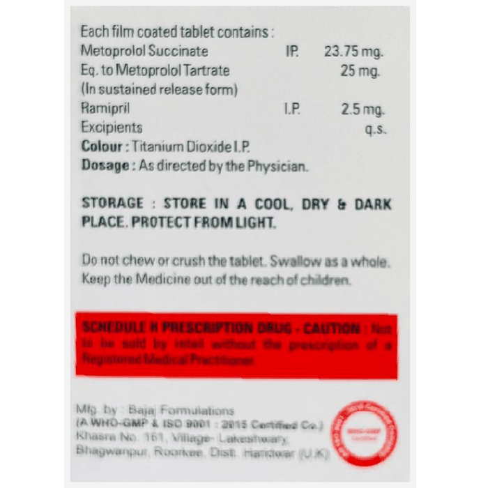 Salt Composition Metoprolol Succinate (25mg) + Ramipril (2.5mg)
