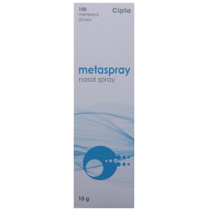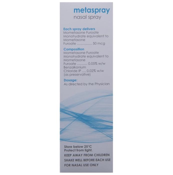 Metaspray Nasal Spray is a medicine used to prevent and treat allergic symptoms like sneezing and runny nose due to allergies nasal congestion and nasal polyps. It works by reducing swelling and irritation in your nose and belongs to a group of medicines called corticosteroids.You should always use Metaspray Nasal Spray as advised by your doctor. To get the full benefit of the medicine you should take it regularly. Blow your nose gently before using it keep one nostril closed while applying the medicine into the other and then sniff hard to make sure it reaches deep into the nose. Repeat for the other nostril.The most common side effects of this medicine include nasal irritation sore throat wheezing nosebleed upper respiratory tract infection viral infections and vomiting. If you are worried about any of the side effects let your doctor know. Your doctor might be able to help you cope with the side effects. In general you should try to avoid situations which make your symptoms worse (things like pollen and dust mites) and it’s best not to smoke.Before using this medicine you should ask your doctor for advice if you are pregnant or breastfeeding. It is important to discuss the risks and benefits with your doctor. Let your doctor also know if you have any other medical conditions taking any other medicines.