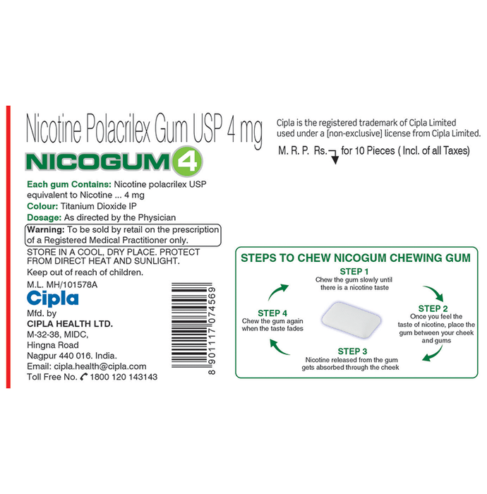 Nicogum 4 Nicotine Gum Chewing Gums Fresh Mint Sugar Free is a medicine used to quit smoking by reducing the craving for a cigarette and the irritable feeling that occurs when you stop smoking. It works by mimicking the effect of nicotine by binding to the nicotine receptors in the brain.Nicogum 4 Nicotine Gum Chewing Gums Fresh Mint Sugar Free can be used to help you stop smoking completely or cut down the amount you smoke. Stopping smoking is hard and you need to be ready and committed. But quitting is one of the most important things you can do to improve your health and live longer. This medicine should be taken as advised by doctor as it can be habit forming. In case you have missed any dose take it as soon as you remember it. Do not skip any doses and finish the full course of treatment. However before taking this medicine it is better to inform doctor if you are suffering from any heart liver or kidney disease. You must not smoke while using this medicine as it can result in dangerous effects.Many people use more than one type of nicotine replacement therapy (NRT) to improve their chances such as nose or mouth sprays which also contain nicotine. You are more likely to be successful if you also have counselling join a support group and make some behaviour changes such as avoiding situations you associate with smoking.Some of the common side effects include nausea vomiting sore throat and mouth. It may also cause dizziness and sleepiness so do not drive or do anything that requires mental focus until you feel better. It may cause headaches so it is better to take plenty of fluids whole day but inform your doctor if it does not go away. These effects are often mild and will wear off with time. If you are pregnant or breastfeeding you must consult doctor before taking this medicine.