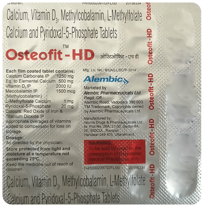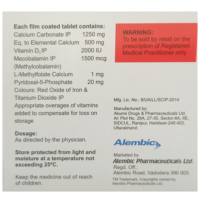 Salt Composition Calcium Carbonate (1250mg) + Vitamin D3 (2000IU) + Methylcobalamin (1500mcg) + L-Methyl Folate Calcium (1mg) + Pyridoxal-5-phosphate (20mg)