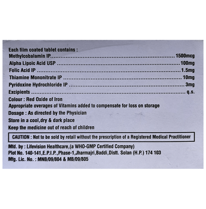Salt Composition Methylcobalamin (1500mcg) + Alpha Lipoic Acid (100mg) + Thiamine mononitrate (10mg) + Pyridoxine Hydrochloride (3mg) + Folic Acid (1.5mg)