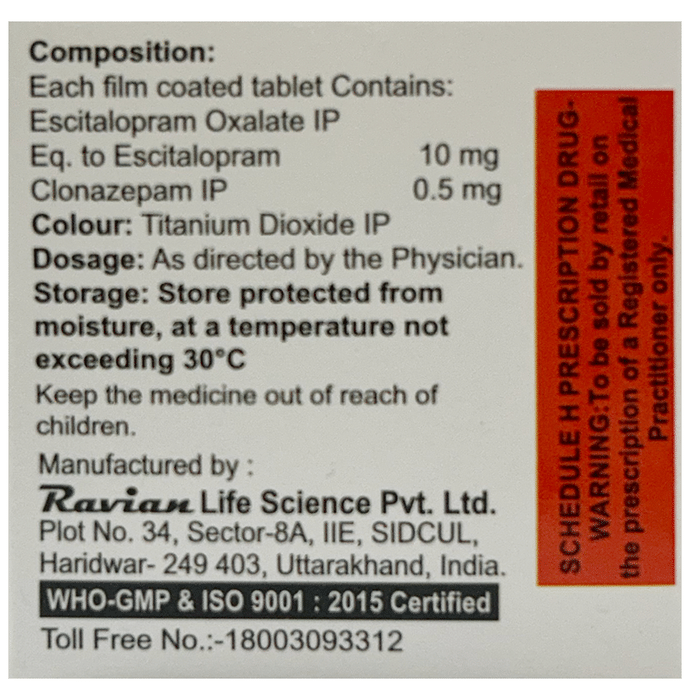 Salt Composition Clonazepam (0.5mg) + Escitalopram Oxalate (10mg)