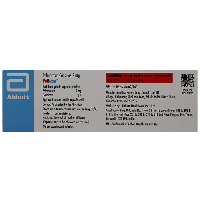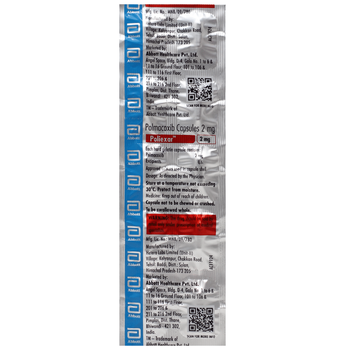 Poliexar Capsule is a nonsteroidal anti-inflammatory drug (NSAID) that is used to treat osteoarthritis of knee and hip joints. It inhibits the production of certain enzymes involved in inflammation resulting in reduced inflammation pain and stiffness in the joints and improves the function of joints.Poliexar Capsule should be taken with food to reduce the risk of an upset stomach. Take it in the dose and duration prescribed by your doctor. Also continue taking this medicine for as long as your doctor prescribes it because if you stop taking the medicine abruptly the symptoms may return.Some common side effects of this medicine are headache nausea and upset stomach. These side effects are usually mild and go away on their own. However if any of these symptoms get worse or bother you consult with the doctor.Do not take Poliexar Capsule if you have a known history of allergic reactions to any of the ingredients of this medicine. Let your doctor know if you are taking have recently taken or might take any other medicines. To ensure that this medication is safe for you also inform the doctor if you have any other pre-existing medical conditions. This medicine is contraindicated in pregnant and breastfeeding women as it can cause harm to the developing baby.