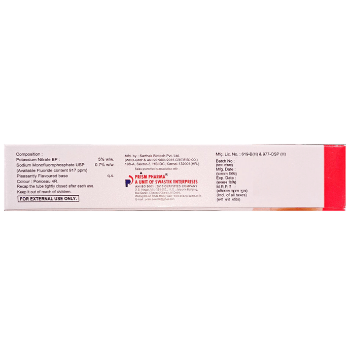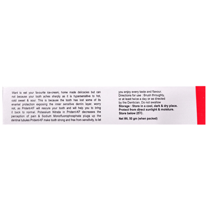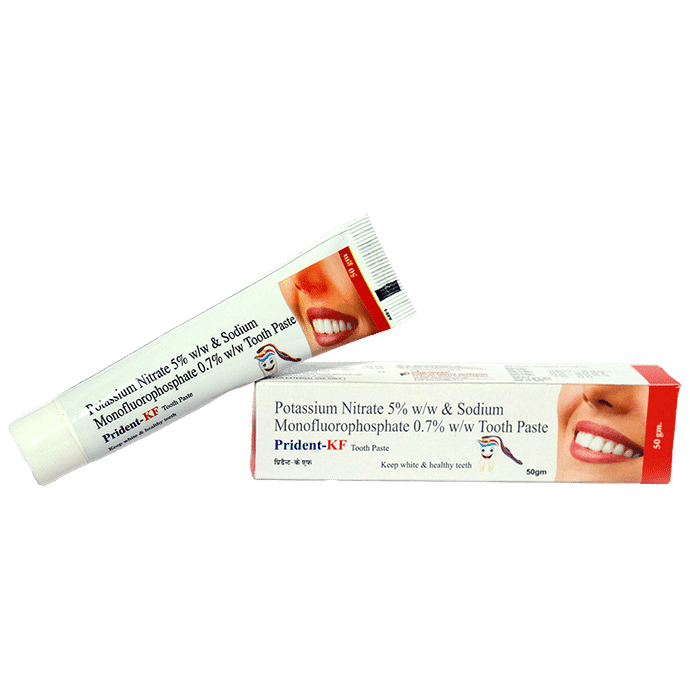 Prident-KF Toothpaste is a combination of two medicines is used to treat dental cavities. It reduces the pain and sensitivity while having cold and hot food items. It also makes the teeth stronger and prevents cavities in the future.Prident-KF Toothpaste is strictly advised for external use only. Use it in the dose and duration advised by your doctor. Apply it only to the affected teeth. It should not be used in excess amount. Avoid swallowing the medicine. In case of accidental contact with your eye rinse it off with plenty of water.This medicine is generally safe and does not usually cause any common side effects. However if you experience any allergic reactions such as itching swelling and rashes consult a doctor immediately.