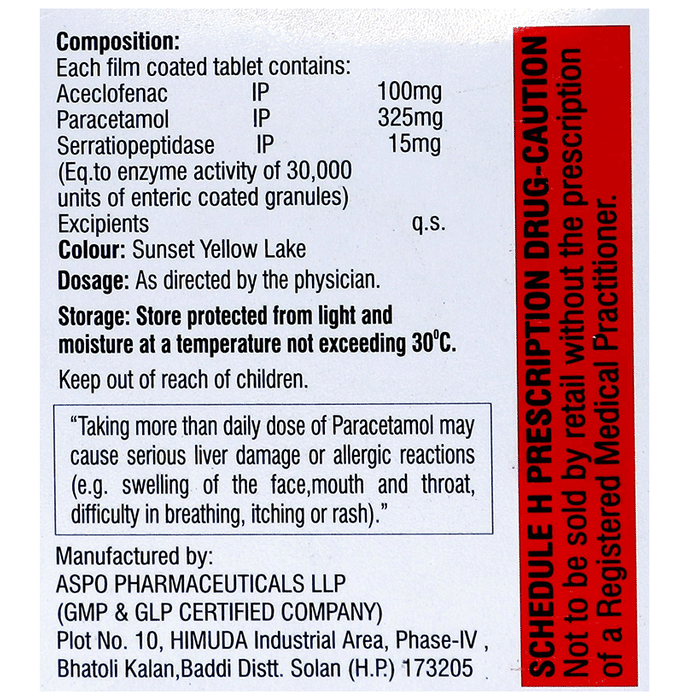 Salt Composition Aceclofenac (100mg) + Paracetamol (325mg) + Serratiopeptidase (15mg)