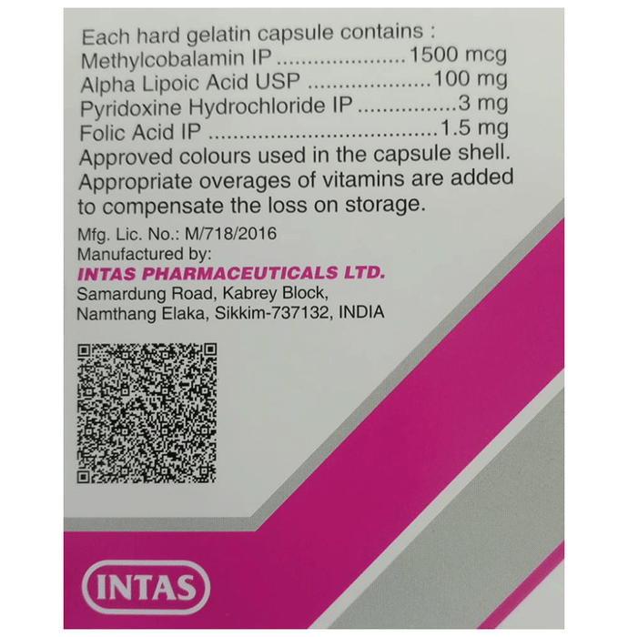 Salt Composition Methylcobalamin (1500mcg) + Alpha Lipoic Acid (100mg) + Vitamin B6 (Pyridoxine) (3mg) + Folic Acid (1.5mg)
