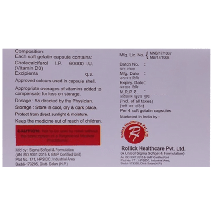 Q. Is it better to take Rocifero-D3 Softgel Capsule at night or in the morning?::: You can take Rocifero-D3 Softgel Capsule at any time of the day morning or night. However there is limited information available about the best time to take Rocifero-D3 Softgel Capsule. Take it exactly as advised by your doctor.| Q. What are the benefits of taking Rocifero-D3 Softgel Capsule?::: Rocifero-D3 Softgel Capsule is important for maintaining bone health support the health of the immune system brain and nervous system. It also regulates insulin levels and is also important for a healthy heart and blood vessels.| Q. How should Rocifero-D3 Softgel Capsule be taken?::: Rocifero-D3 Softgel Capsule should be swallowed whole with water and should not be crushed or chewed. It is advised to take it with the main meal of the day to increase its absorption.| Q. Who should not take Rocifero-D3 Softgel Capsule?::: Rocifero-D3 Softgel Capsule should not be taken by patients who are allergic to cholecalciferol patients with increased levels of calcium in the blood or if there is presence of calcium in the urine. Its use should be avoided by patients who have kidney stones or have severe kidney problems.| Q. What happens if I take too much Rocifero-D3 Softgel Capsule?::: Taking too much Rocifero-D3 Softgel Capsule for a long period of time may increase the levels of calcium in the blood (hypercalcemia). This may cause weakness fatigue vomiting diarrhea sluggishness kidney stones increased blood pressure and growth retardation in children.| Q. How much vitamin D should I take daily?::: The daily requirement of vitamin D is 4000 IU/day. Since your diet may not be meeting the daily requirement of vitamin D therefore you may need 1000 - 3000 IU/day of supplements of vitamin D. Rocifero-D3 Softgel Capsule is a form of vitamin D which is used as a supplement in patients with vitamin D deficiency.| Q. What happens if vitamin D is low?::: Low levels of vitamin D may cause rickets in children and osteomalacia in adults. Vitamin D deficiency may also increase the risk of diabetes mellitus 1 high blood pressure depression some cancers and osteoporosis.