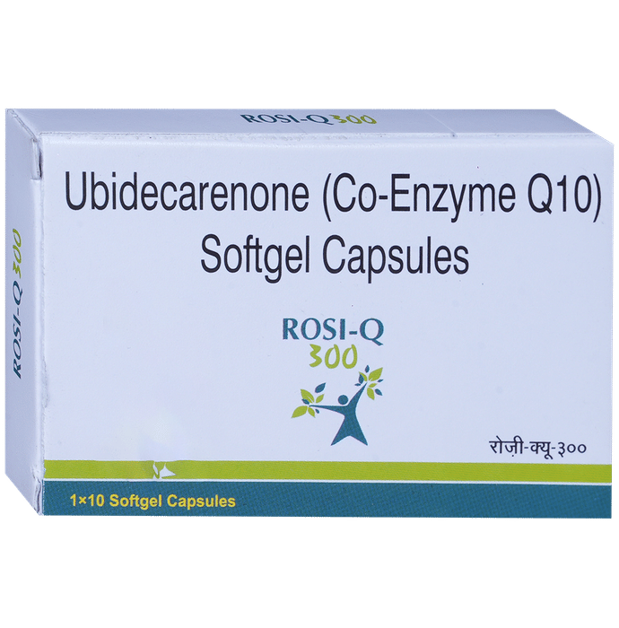 Q. What are the health benefits of Rosi-Q 300 Soft Gelatin Capsule?::: Rosi-Q 300 Soft Gelatin Capsule contains Coenzyme Q10 which is a vitamin-like substance that is important for life and health of every cell. It is required by the cells of the body to function properly and produce energy. It also helps to fight oxidative stress. Maximum concentrations of it are found in the heart liver kidney and pancreas and lowest concentration in the lungs. It is an antioxidant and has an ability to stimulate the immune system. It also beneficial for the health of the heart.| Q. Who should take Rosi-Q 300 Soft Gelatin Capsule?::: You should take Rosi-Q 300 Soft Gelatin Capsule only if doctor has advised you. Rosi-Q 300 Soft Gelatin Capsule has a beneficial role when taken with other medicines in patients with heart failure angina high blood pressure Parkinson’s disease and migraine. It may also be advised in patients with Coenzyme Q10 deficiency HIV/AIDS or in patients taking adriamycin. Rosi-Q 300 Soft Gelatin Capsule is an additional therapy to the prescribed treatment. Do not substitute Rosi-Q 300 Soft Gelatin Capsule for actual treatment required for these particular diseases.| Q. Is Rosi-Q 300 Soft Gelatin Capsule bad for the liver?::: Rosi-Q 300 Soft Gelatin Capsule may cause an increase in liver enzymes. Therefore if you have liver disease inform your doctor before you start taking this medicine. Other common side effects of Rosi-Q 300 Soft Gelatin Capsule include sleeplessness rashes nausea upper abdominal pain dizziness sensitivity to light irritability headaches heartburn and fatigue.| Q. Can Rosi-Q 300 Soft Gelatin Capsule cause sleeplessness?::: Yes Rosi-Q 300 Soft Gelatin Capsule may cause sleeplessness however it does not affect everyone. Consult your doctor if you have difficulty sleeping after taking Rosi-Q 300 Soft Gelatin Capsule.| Q. Is Rosi-Q 300 Soft Gelatin Capsule good for weight loss?::: Yes Rosi-Q 300 Soft Gelatin Capsule may cause a decrease in fat cells (adipose tissue) and an increase in the number of good fatty cells (brown adipose tissue). This may cause weight loss thereby helping in obesity. However you should take Rosi-Q 300 Soft Gelatin Capsule for weight loss only if advised by your doctor.| Q. Can I take Rosi-Q 300 Soft Gelatin Capsule with statins at the same time?::: Yes you can take statins and Rosi-Q 300 Soft Gelatin Capsule together. Statins stop the production of cholesterol in the body. Since Coenzyme Q10 is formed via the same pathway as cholesterol the levels of Coenzyme Q10 may decrease during treatment with statins. Therefore taking Rosi-Q 300 Soft Gelatin Capsule may help replenish the levels of Coenzyme Q10 while taking statins.| Q. Can I take Rosi-Q 300 Soft Gelatin Capsule with high blood pressure medication?::: It has been shown that taking Rosi-Q 300 Soft Gelatin Capsule along with blood pressure-lowering medicines can lower blood pressure more effectively. However it should be taken with these medicines only if advised by the doctor. Some blood pressure-lowering medicines may interfere with the working of Rosi-Q 300 Soft Gelatin Capsule. This medicine should not be used with hydralazine clonidine and hydrochlorothiazide.