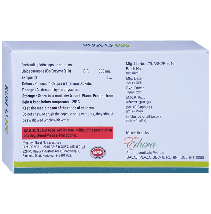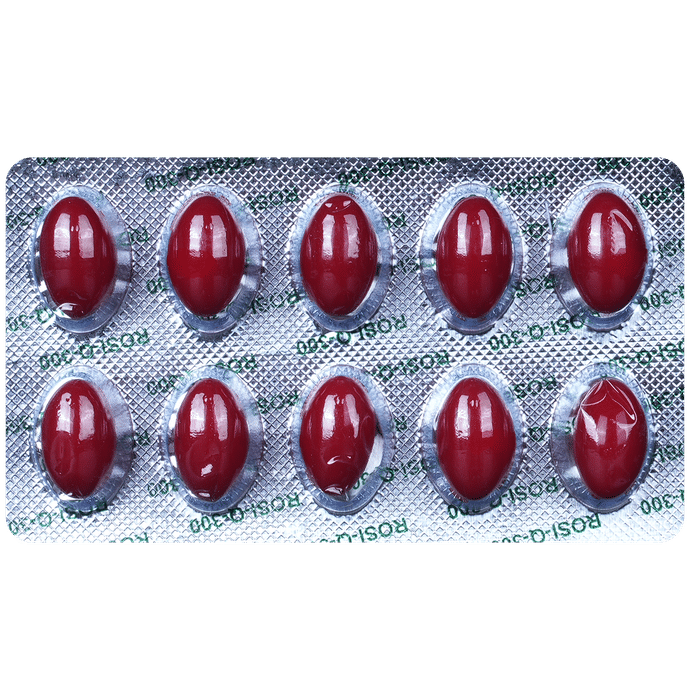 Rosi-Q 300 Soft Gelatin Capsule is a medicine used in the treatment of nutritional deficiencies. It has good antioxidant properties and a number of other health benefits.Rosi-Q 300 Soft Gelatin Capsule should be taken along with food. Take it regularly and at a fixed time each day to get maximum benefit from it. Inform your doctor before taking the medicine if you have any other medical conditions or are taking any other medications.Using of Rosi-Q 300 Soft Gelatin Capsule may cause few side effects such as nausea loss of appetite diarrhea and heartburn. Let your doctor know if they persist or get worse. They may be able to suggest ways to reduce or treat them.Before starting the medicine inform your doctor if you are suffering from any liver diseases. It is important for patients with history of high blood pressure to monitor their blood pressure regularly while taking this medicine.