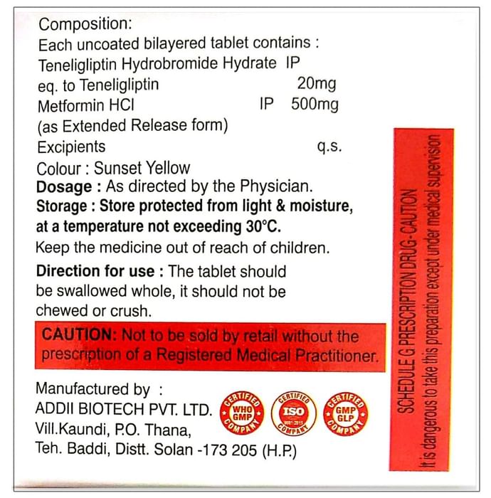 Salt Composition Metformin (500mg) + Teneligliptin (20mg)