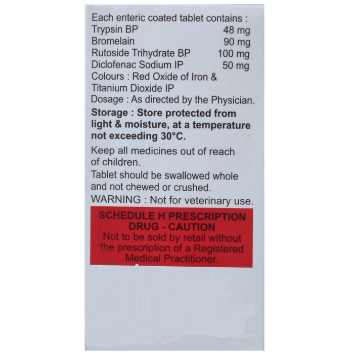 Salt Composition Trypsin (48mg) + Bromelain (90mg) + Rutoside (100mg) + Diclofenac (50mg)
