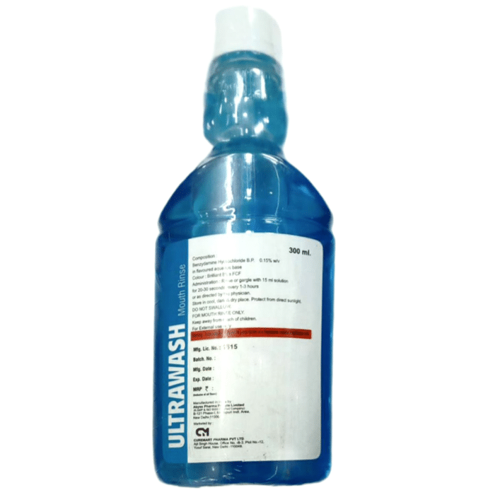 Q. Is Ultrawash Mouth Rinse over the counter?::: No Ultrawash Mouth Rinse is not available over-the-counter. It is sold only upon a prescription by a registered medical practitioner| Q. Does benzydamine contain alcohol/penicillin?::: Yes benzydamine contains 96% ethanol| Q. Does listerine contain Ultrawash Mouth Rinse?::: No it does not contain Ultrawash Mouth Rinse.