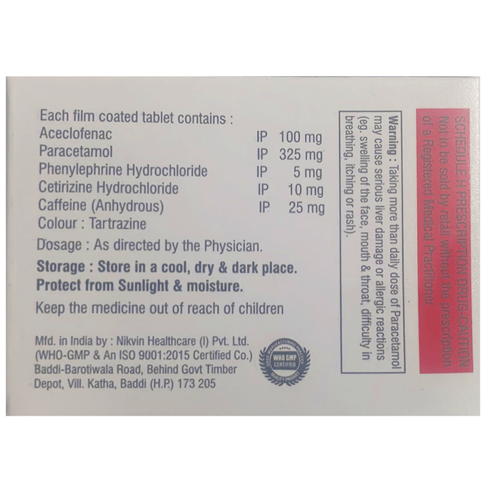 Salt Composition Aceclofenac (100mg) + Paracetamol (325mg) + Cetirizine (10mg) + Phenylephrine (5mg) + Caffeine (25mg)