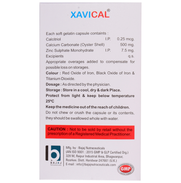 Xavical Softgel Capsule is a combination of medicines that is used to treat nutritional deficiencies. It helps in the absorption of calcium and bone strengthening. It helps in proper growth and development of bones. It also helps in protein synthesis and the production of blood cells (red and white blood cells).Xavical Softgel Capsule may be taken with or without food. It should be used in the dose and duration as prescribed by your doctor. It is advised to take this medicine at a fixed time.This medicine should not be taken more than the recommended dose. It is usually a safe medicine with very minimal or no side effects. However if you experience severe diarrhea vomiting or constipation you should consult your doctor without delay.Before taking this medicine tell your doctor if you have any other health conditions. Inform your doctor if you are taking any other medicines or if you are pregnant or breastfeeding. It is advised not to take alcohol after taking this medicine.